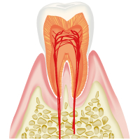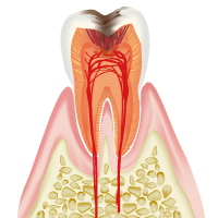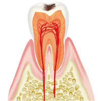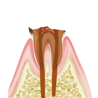 虫歯がさらに進行し、大きな神経にまで達した穴が開いた状態。痛みを伴うことが多く、歯の根の治療をした後、かぶせ物や詰め物をします。